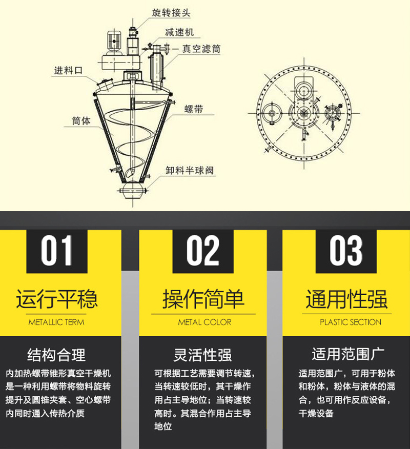 錐形螺帶混合真空干燥機(jī)設(shè)備特點(diǎn):